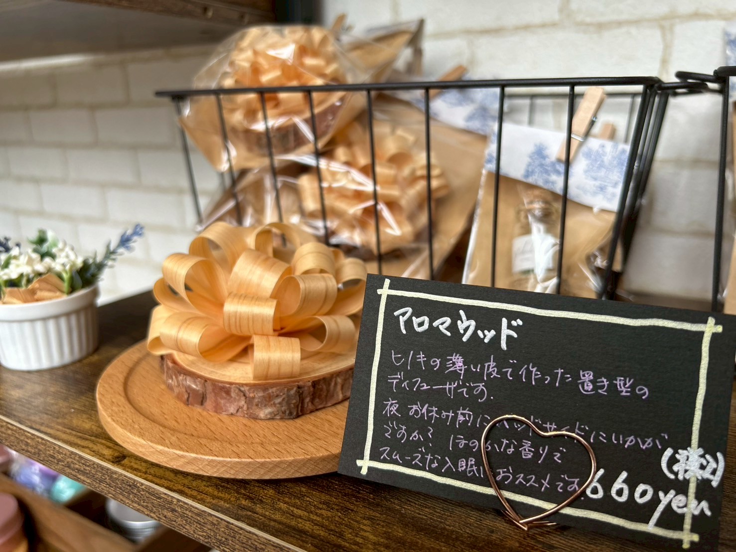 ハンドメイドで作成している商品は、店頭にあるアロマでお好きな香りをお試しいただき、香りをつけることもできます。
